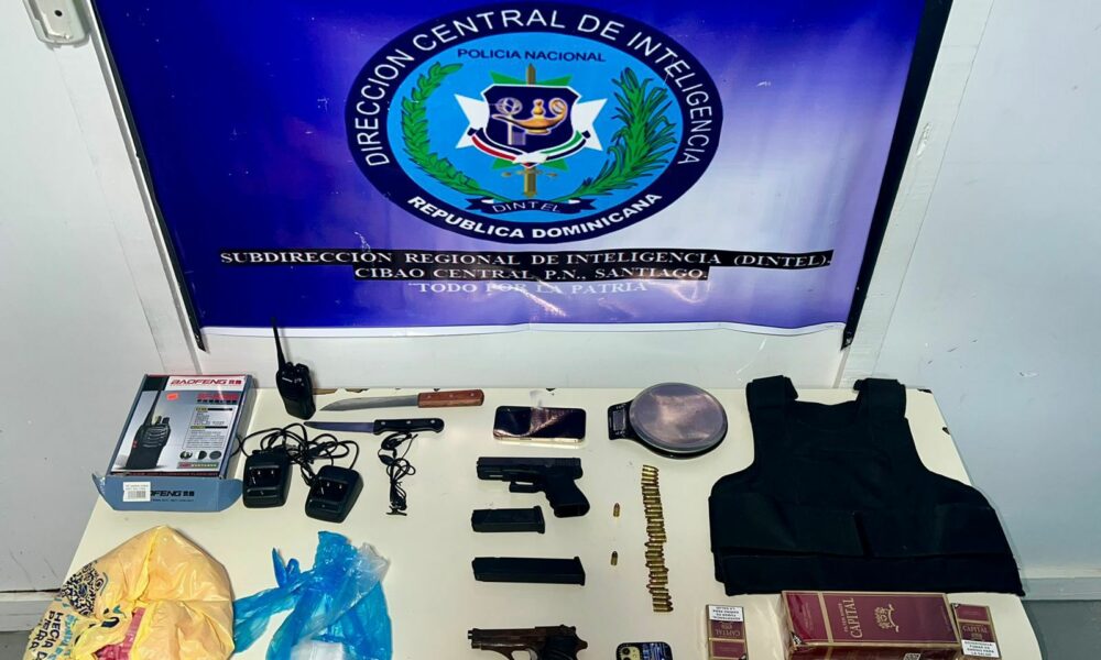 Entre las evidencias incautadas figuran dos armas de fuego ilegales, una pistola Glock modelo 19, calibre 9mm, y otra Titan II, calibre .380, ambas con sus cargadores y municiones, además de un chaleco antibalas, varias armas blancas tipo machete, una balanza digital, teléfonos celulares y un radio portátil.
