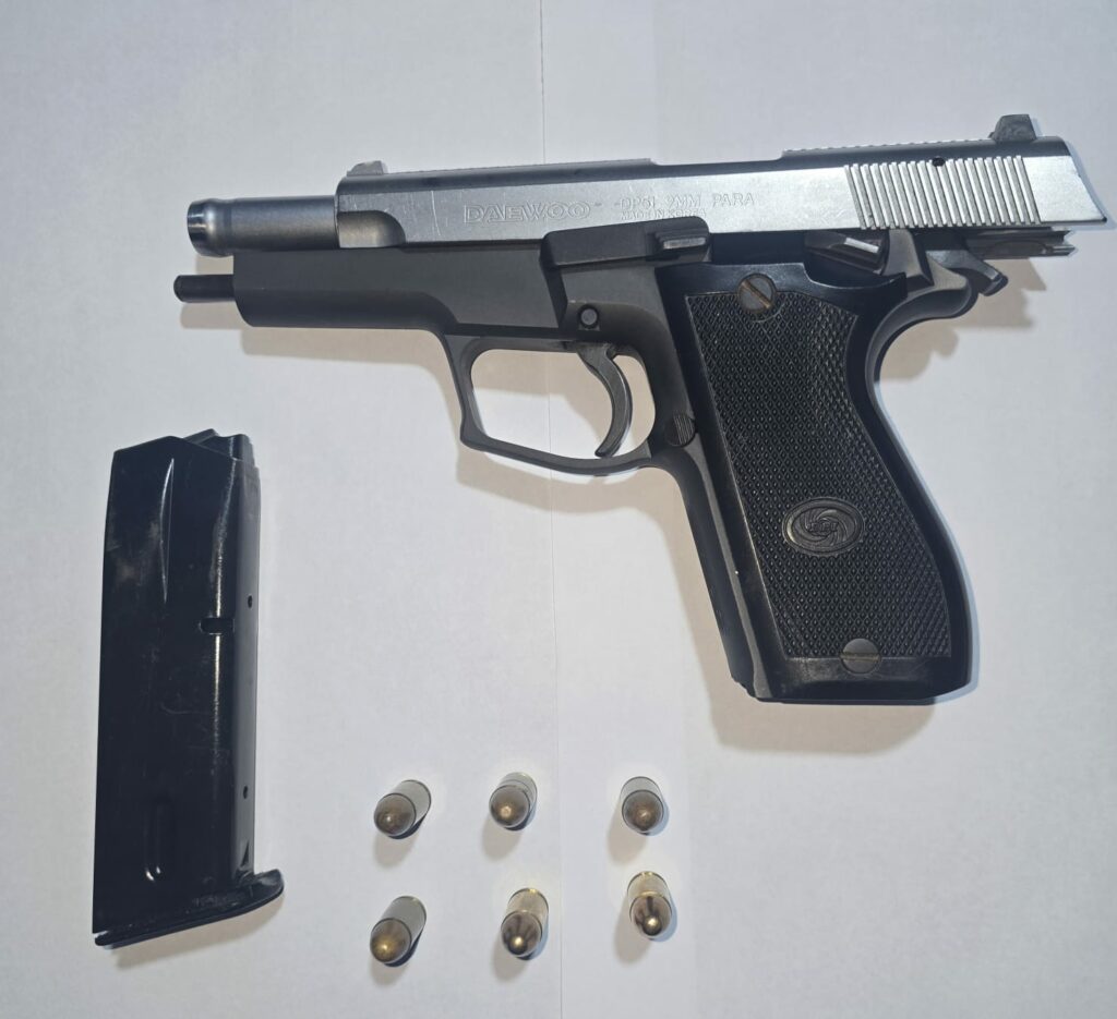 Durante las acciones de arresto, realizadas por miembros de la Subdirección Regional de Investigación Sureste (DICRIM), fueron ocupadas dos pistolas, una marca Daewoo, modelo DP151, calibre 9mm, serie BA502387, con cargador y ocho cápsulas, y una marca Prieto Beretta, modelo 92 Compact, calibre 9mm, serie N447961, con cargador y sin cápsulas.