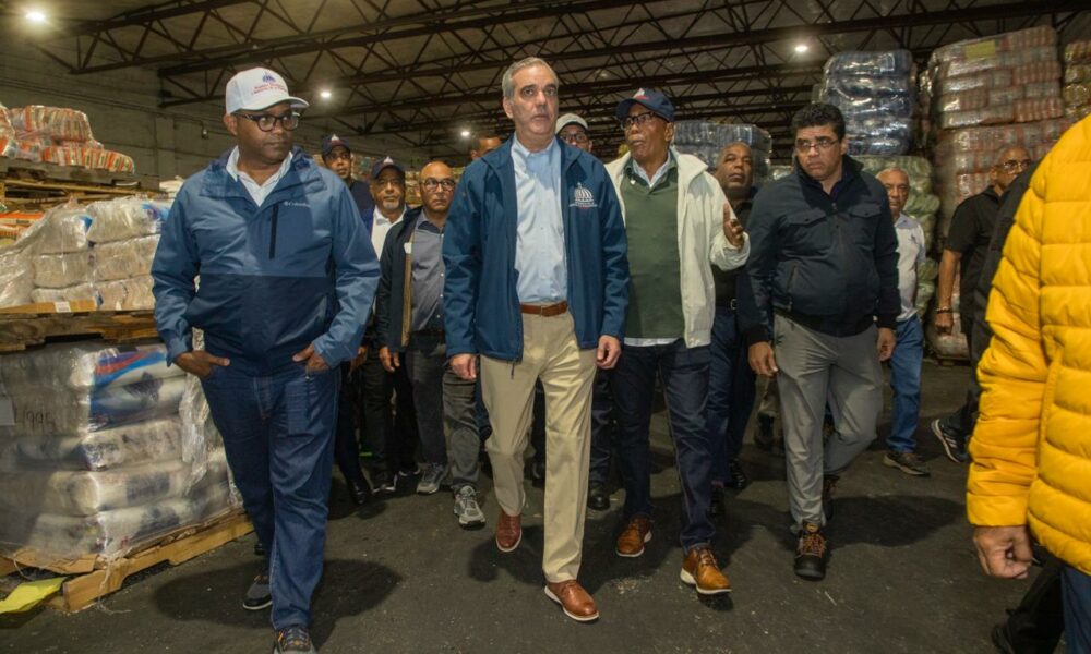 Durante su visita, el mandatario constató el proceso de selección y empaque de productos básicos como arroz, sal, aceite, azúcar, leche, habichuelas, sardinas, coditos, avena y café, que serán distribuidos a las familias damnificadas.